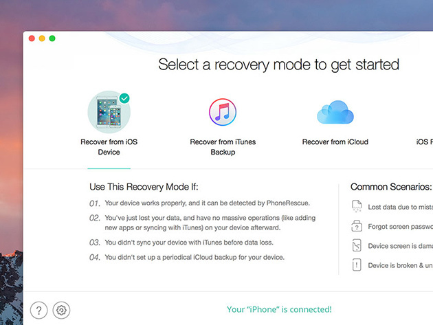 PhoneRescue is an all-inclusive iOS data recovery software designed for retrieving your mistakenly deleted or lost photos, messages, contacts and more on your iPhone, iPad, and iPod touch. It can recover your most important personal data directly to iPhone, or quickly pinpoints precisely what you lost in iTunes or iCloud backup. Best yet, PhoneRescue can fully repair an iPhone from any system crash, without losing a single byte of data.