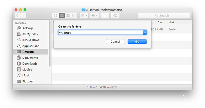 2. Type ~/Library in the box and hit enter. ( “~” is the universal UNIX symbol for the current user’s home folder and “/Library” is the subfolder you want to access )