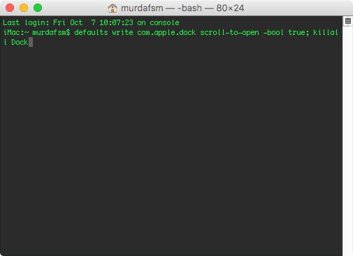2. Type and hit enter: defaults write com.apple.dock scroll-to-open -bool true; killall Dock