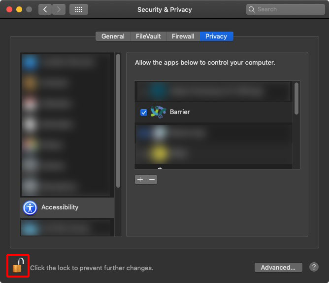 3. On macOS you need to allow barrier to control your computer. To do it go to System Preferences > Security & Privacy > Privacy > Accessibility > click the lock to make changes ( bottom left corner ) > select Barrier.