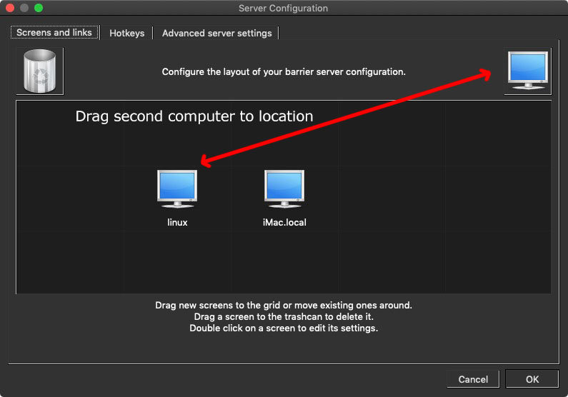 4.1 Set the second computer. There’s a grid. Arrange your computers the way they’re physically set up in front of you. For example, I have my iMac right in front of me while the linux machine is on the left side. I’ve arranged the machines accordingly in Barrier.
