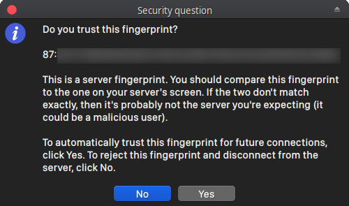 8. Your client machine will ask you if you accept the server’s fingerprint. Check the server window and see if the SSL fingerprint matches. If it does, click yes.