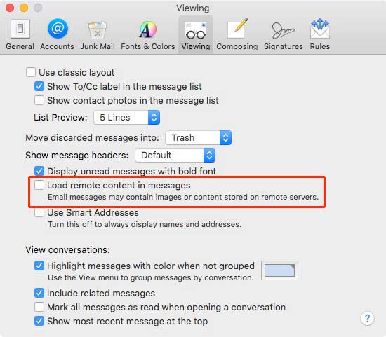 If you’re on a Mac and use the default Mail client go to Preferences > Viewing > and uncheck “Load remote content in messages”