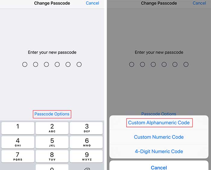 You have three options for a passcode: 4-digit numeric code, custom numeric code ( 6 digits ) and custom alphanumeric code.