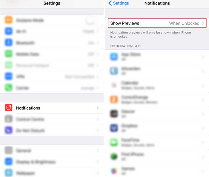 Next thing you can do, is disable lockscreen notifications for apps like Messages. To do that go to Settings > Notifications > [app name] > and disable “Show on Lock Screen”