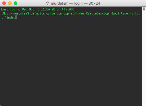 2. Type in defaults write com.apple.finder CreateDesktop -bool true;killall Finder