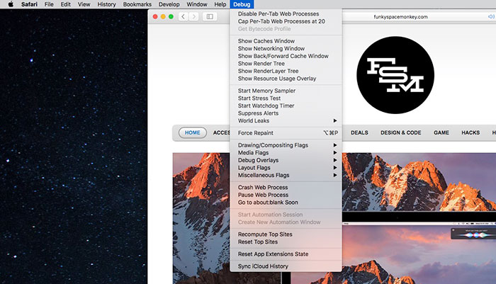 NOTE: to hide Safari’s Debug menu, type the following command defaults write com.apple.Safari IncludeInternalDebugMenu 0