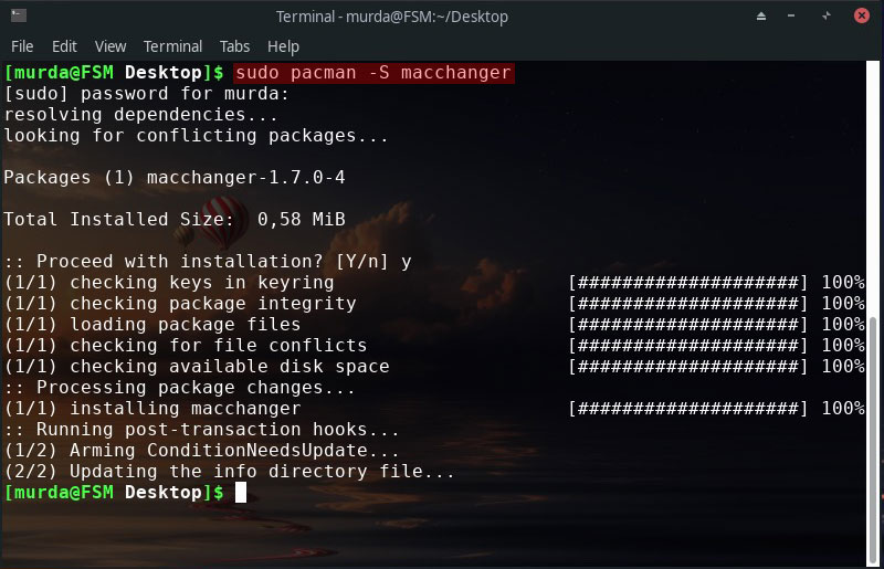 2. Install ‘macchanger’. The package should be availble in your distro package manager or you can install it via terminal by typing sudo pacman -S macchanger OR sudo apt-get install macchanger OR equivalent for your distro.