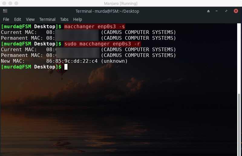 sudo ifconfig enp0s3 down && sudo macchanger enp0s3 -r && sudo ifconfig enp0s3 up ( change ‘enp0s3’ accordingly to reflect your setup )