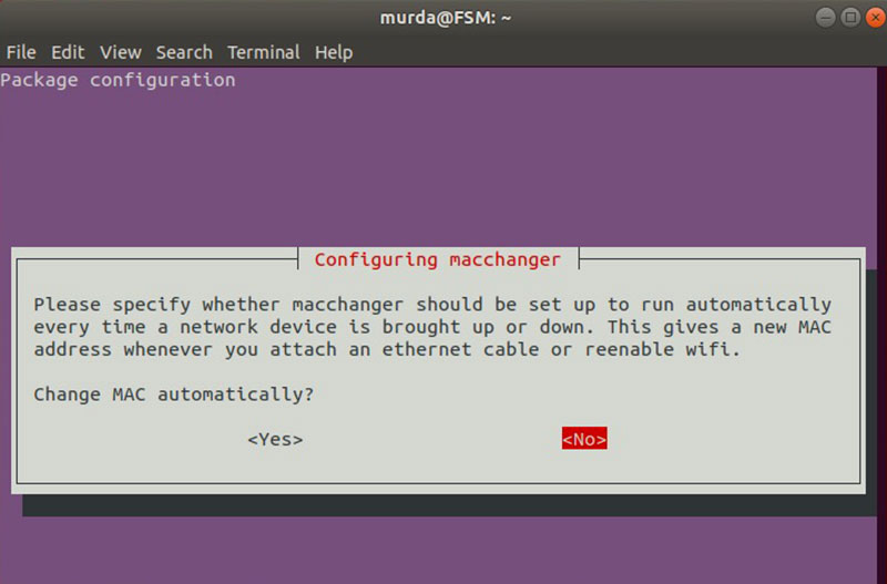NOTE: on some distros, during macchanger installation you will be prompted with the following screen asking you if you’d like to automatically change your MAC address every time your network interface goes online.