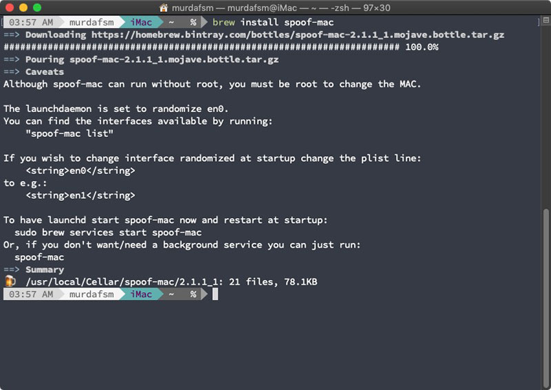 3. Install SpoofMAC via Homebrew. In the terminal type brew install spoof-mac
