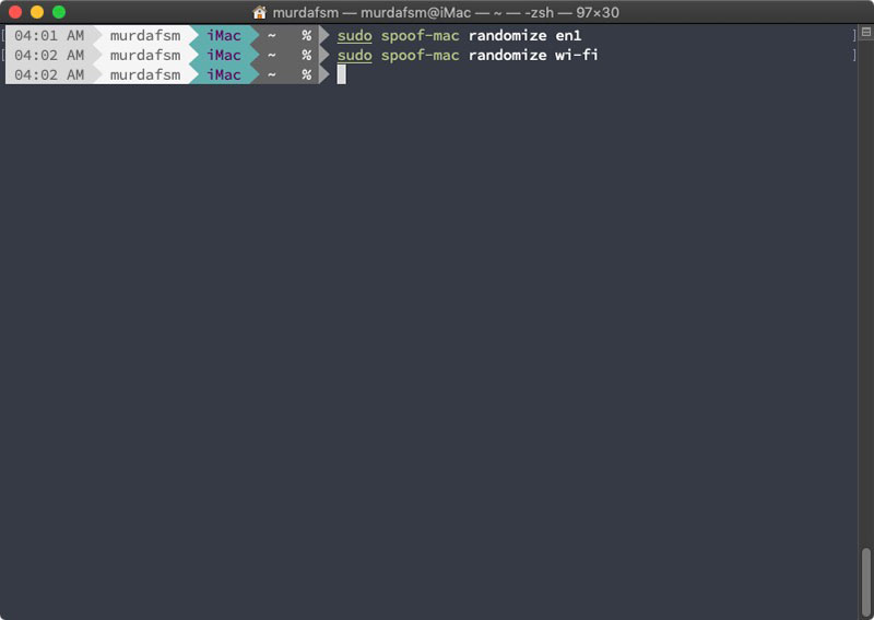 5. To randomize your MAC address type sudo spoof-mac randomize en1 or sudo spoof-mac randomize wi-fi.