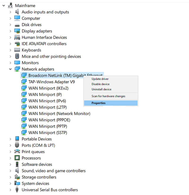 - Open Device Manager and under “Network adapters” right click on the network interface that you want to modify, and select properties.