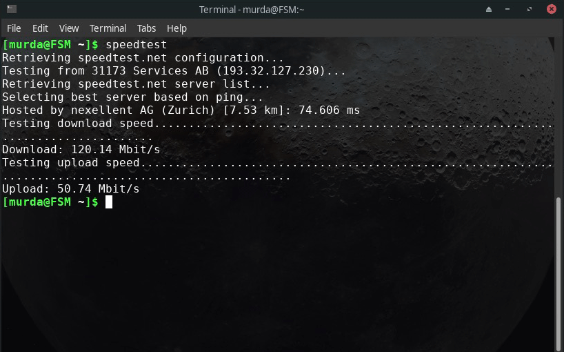 3. To check your internet speed simply type speedtest or speedtest --simple for speedtest-cli to output only the ping, download and upload speeds. For other options, see step 2.