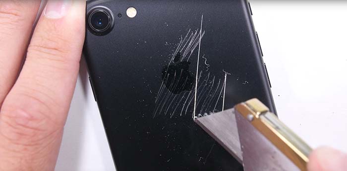 The back cover of the matte black iPhone 7 can take scratches from keys, but something like a razor blade will scratch the phone just fine.