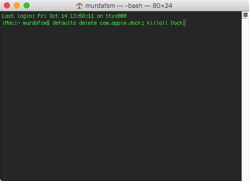 2. Type defaults delete com.apple.dock; killall Dock